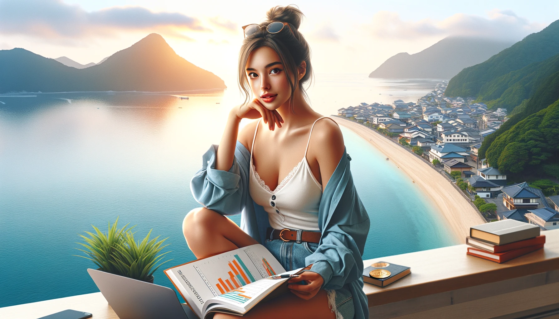 2024.04.05 DALL·E 2024-03-10 21.34.11 – Create an image of a confident and serene beautiful girl, embodying a relaxed island lifestyle, who is also portrayed as studying investment materials shimabito