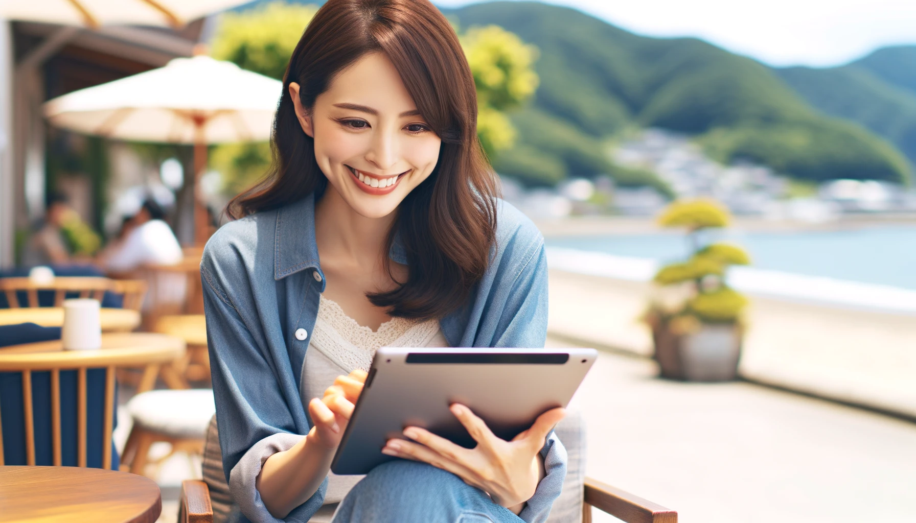 2024.04.05 DALL·E 2024-03-10 21.35.22 – Create an image of a cheerful young woman sitting outdoors on Awaji Island, holding a digital tablet and looking at it with an intrigued and motivated shimabito