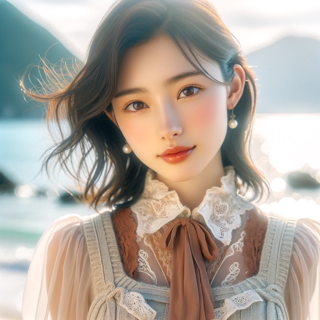2024.04.05 DALL·E 2024-03-12 21.19.05 – This updated image portrays a beautiful Japanese girl on Awaji Island with an emphasis on inner purity and innocence, dressed in Western-style clothin shimabito