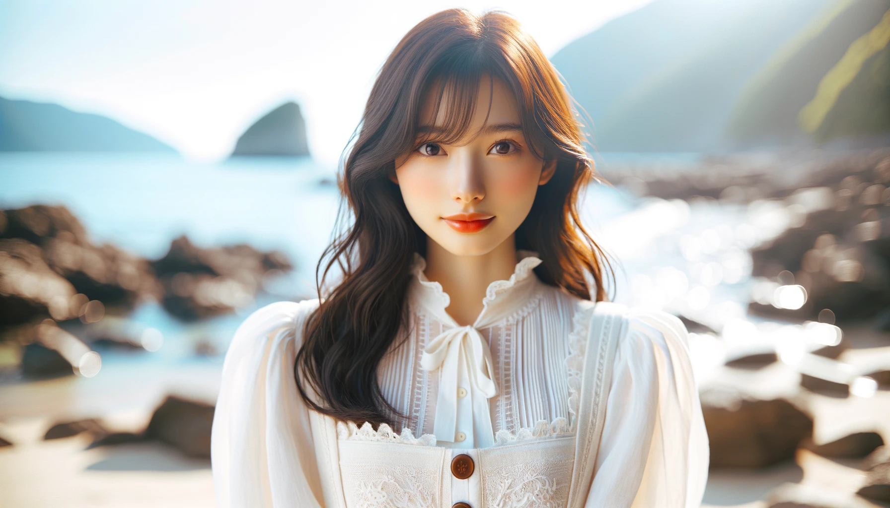 DALL·E 2024-03-12 21.30.37 – This updated image portrays a beautiful Japanese girl on Awaji Island with an emphasis on inner purity and innocence, dressed in Western-style clothin