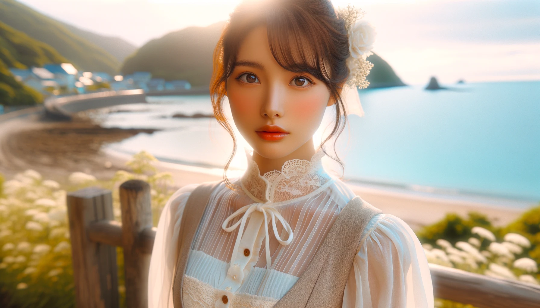 DALL·E 2024-03-12 21.35.43 – This updated image portrays a beautiful Japanese girl on Awaji Island with an emphasis on inner purity and innocence, dressed in Western-style clothin