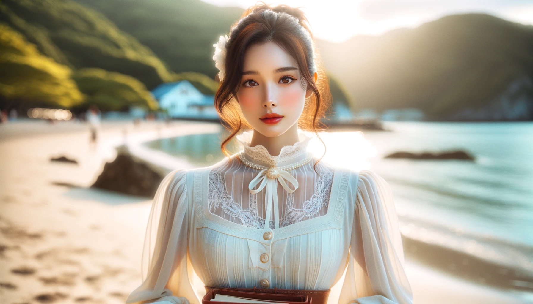 DALL·E 2024-03-12 21.35.51 – This updated image portrays a beautiful Japanese girl on Awaji Island with an emphasis on inner purity and innocence, dressed in Western-style clothin