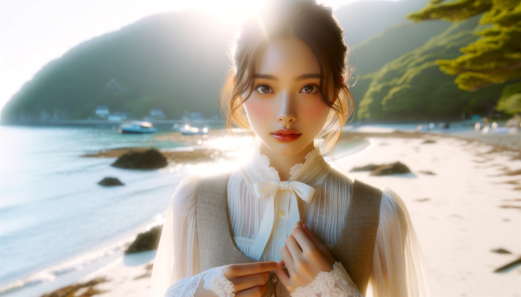 2024.04.05 DALL·E 2024-03-12 21.41.31 – This updated image portrays a beautiful Japanese girl on Awaji Island with an emphasis on inner purity and innocence, dressed in Western-style clothin shimabito