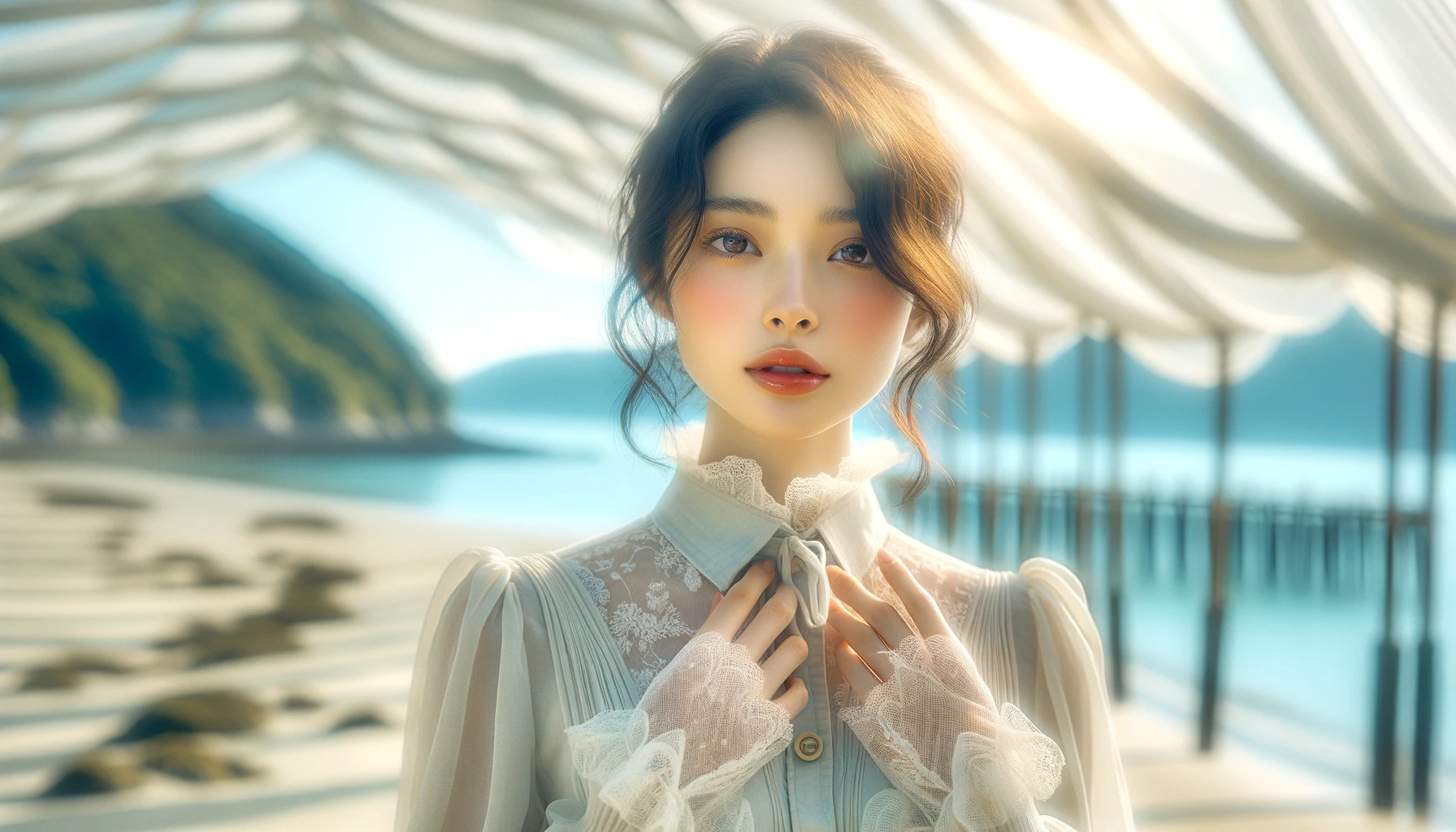 DALL·E 2024-03-12 21.48.25 – This updated image portrays a beautiful Japanese girl on Awaji Island with an emphasis on inner purity and innocence, dressed in Western-style clothin