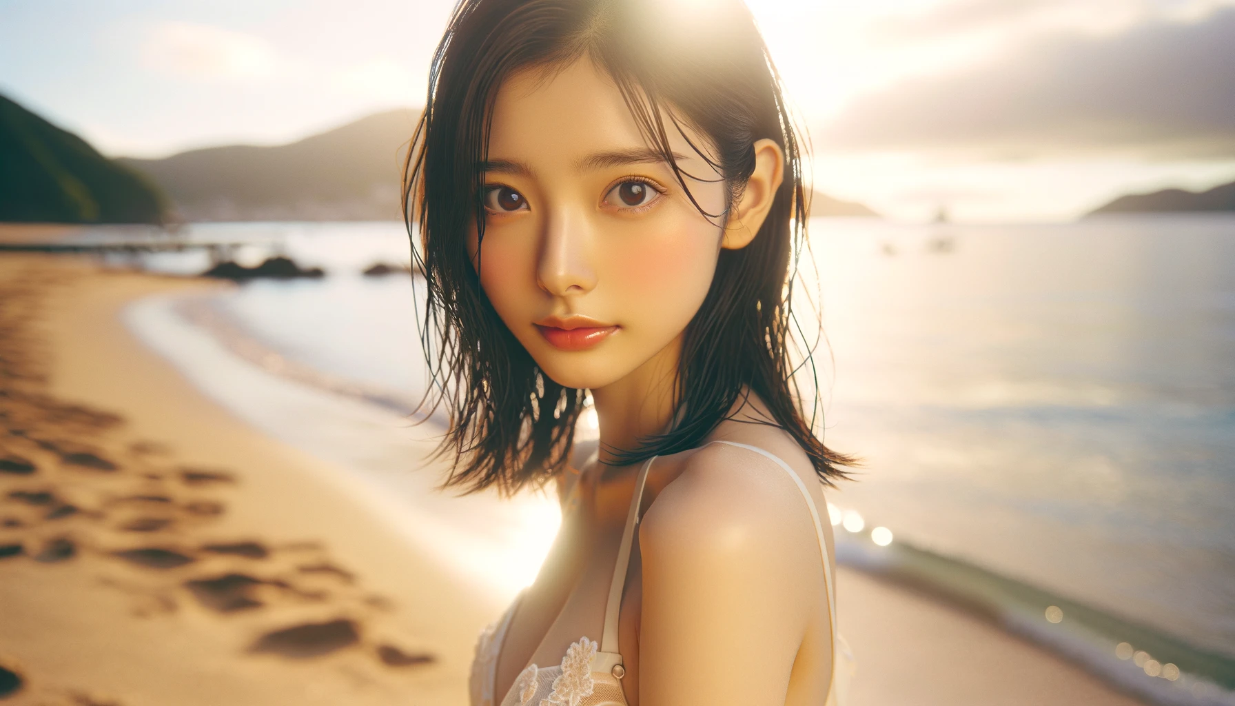 2024.04.05 DALL·E 2024-03-28 13.16.10 – This image captures a beautiful Japanese girl on Awaji Island with a wider angle, offering a more comprehensive view of her in the serene beach settin shimabito