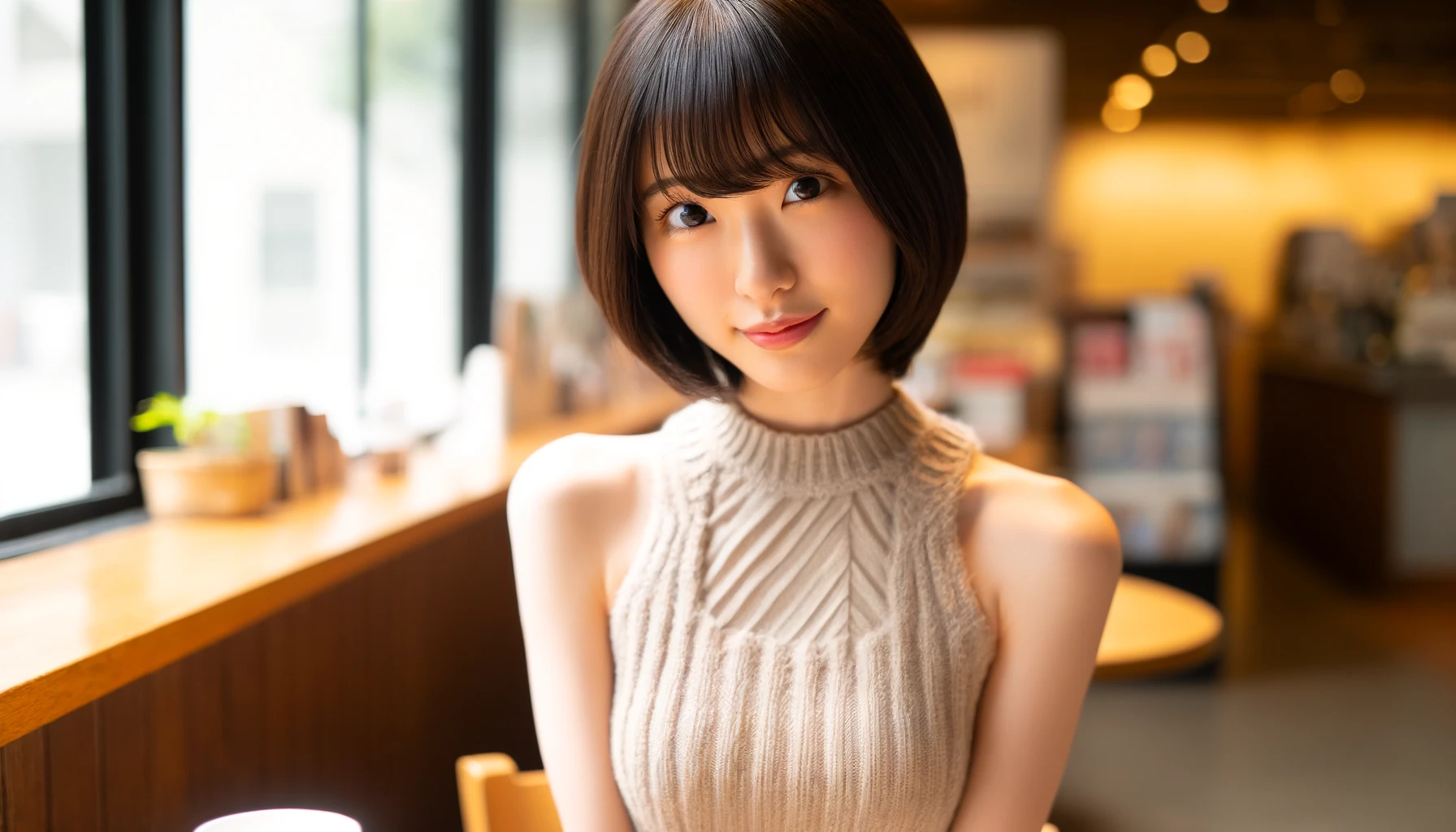 2024.04.05 DALL·E 2024-04-04 22.38.21 – Create an image of a tall Japanese young woman with a bob haircut, portraying her cuteness and youthful appeal. She is wearing a stylish sleeveless kn shimabito
